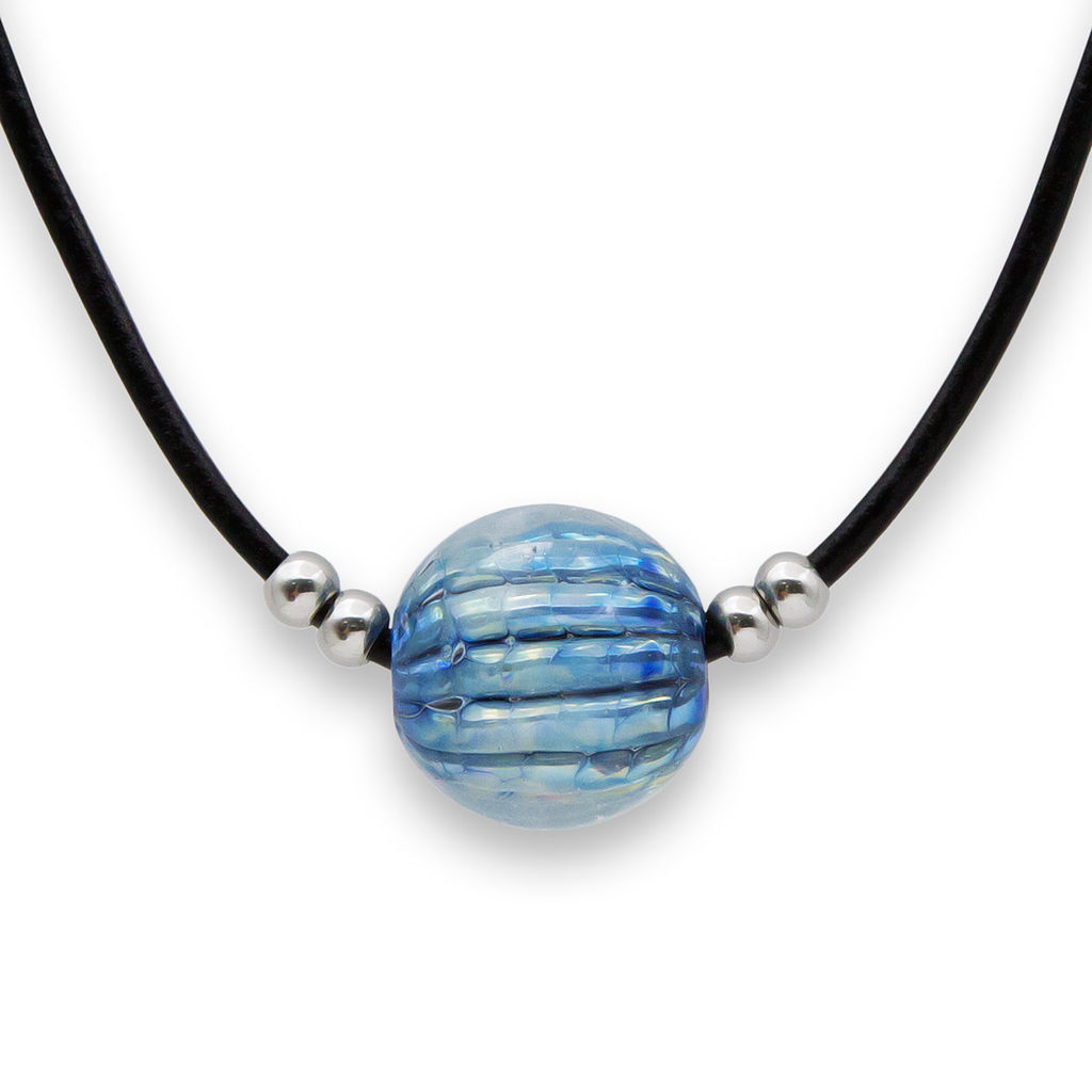 Колье изготовлено из натуральной кожи, муранского стекла и гипоаллергенной ювелирной стали, что очень важно для людей с чувствительной кожей. Металл не темнеет и не подвергается воздействиям окружающей среды, надолго обеспечивая красивый внешний вид изделия. Длина колье - 46 см + 5 см. удлиняющая цепочка. Диаметр бусины - 2,4 см. Вес - 26 гр.­