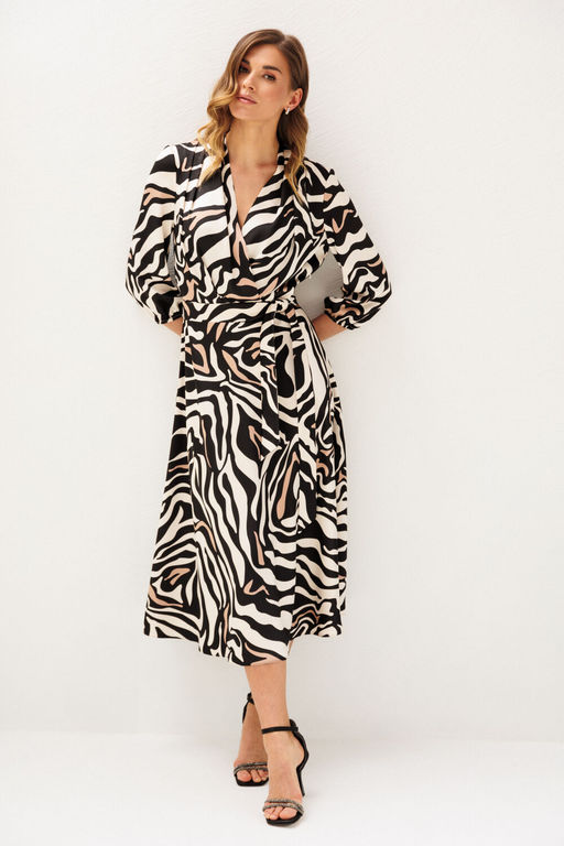 Состав: Вискоза-30%; ПЭ-68%; Эластан-2%; Платье создано из струящейся плотной сатиновой группы, отрезное по линии талии и притачной юбкой кроя по косой. Лиф платья отрезной с фиксируемыми по талии сторонами на запах. В плечевых швах и линии талии заложены модельные складки. Горловина изделия по спинке имеет незначительную стойку 2 см, переходящую на полочку в углубленный V-образный вырез. Рукав втачной, одношовный, оканчивается деликатной сборкой на закрытую эластичную тесьму (резинку). Длина рукава 45-48 см. Крой юбки выполнен по косой, что придает изделию струящийся шарм. В левом боковом шве размещена застежка на потайную молнию. Платье дополнено съемным текстильным поясом. Длина платья по спинке 124-128 см (в зависимости от размерного ряда). Особые рекомендации: рекомендуется холодная деликатная ручная стирка, без использования отбеливающих СМС, без интенсивного трения. Сушка в вертикальном положении. ВТО с минимальным паром. -- Характеристики -- Состав: Вискоза-30%; ПЭ-68%; Эластан-2%; Сезон: Лето Рост: 164 Страна бренда: Беларусь