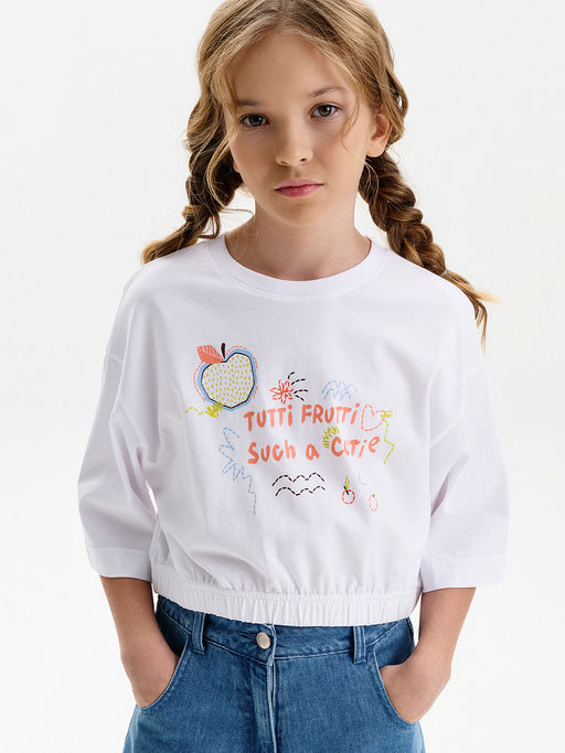 Укороченная футболка (кроп-топ) для девочки. Модель длиной до талии, выполнена из мягкого хлопкового трикотажа. Свободный прямой крой и спущенная линия плеча создают комфортную посадку. Круглая горловина оформлена эластичной рибаной. Широкие короткие рукава доходят до локтя. По низу удобная резинка, которая помогает красиво держать форму и подчёркивает силуэт. Перевод: ТУТТИ ФРУТТИ; ТАКАЯ МИЛАШКА.