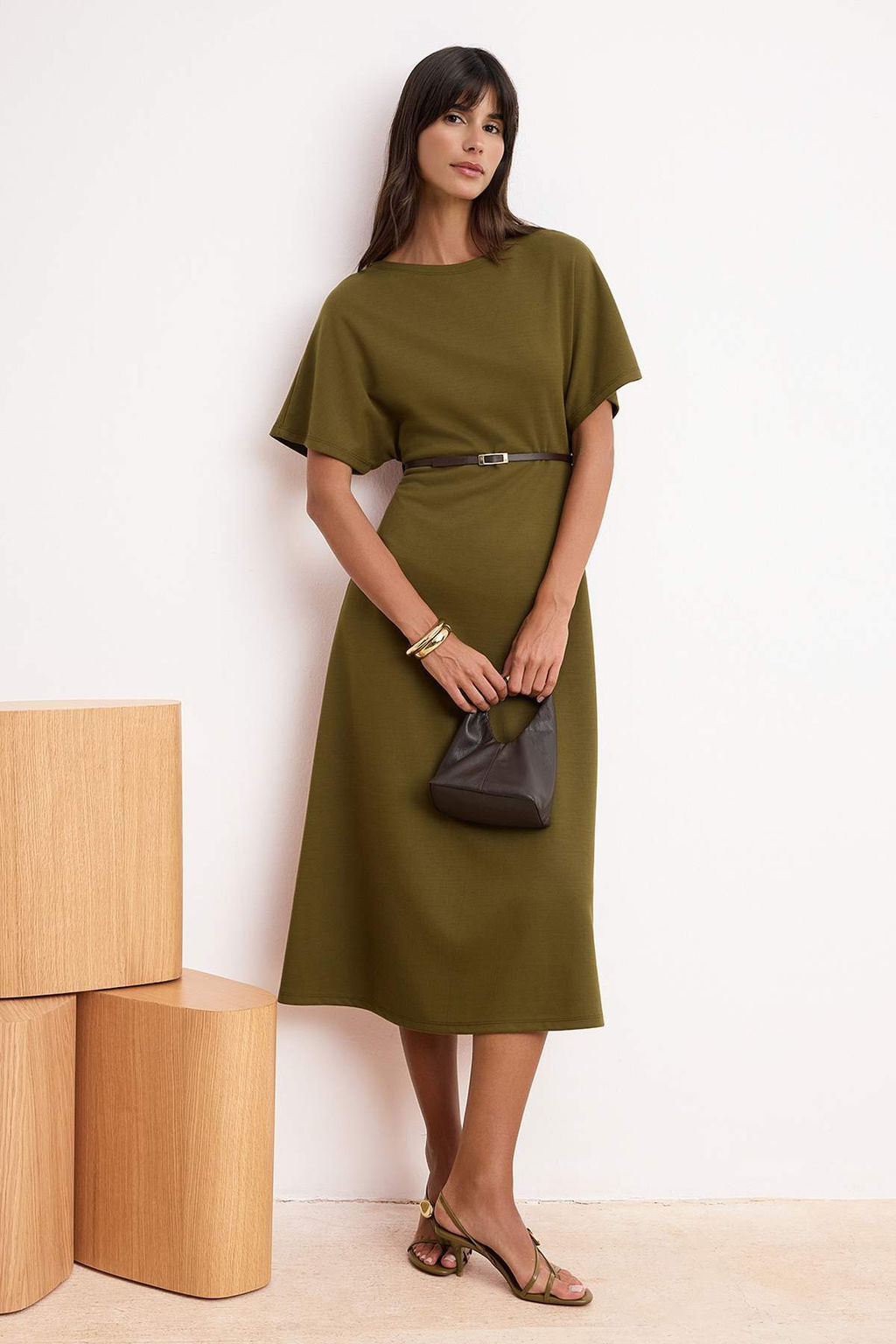 Haki A-Kesim/Can Form Kay?k Yaka K?sa Kollu Kemerli Midi Interlok Orme Elbise TWOSS26EL00107