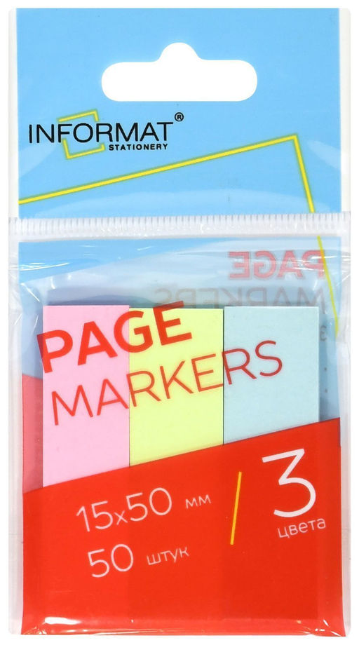 Цена за 10 шт. Закладки клейкие бумажные INFORMAT 15х50 мм 50 шт по 3 цв. ассорти пастельные