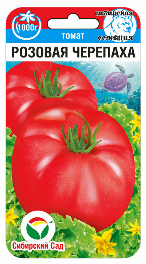Много крупных ровных плодов весом, до 1 кг и более! Среднеспелый крупноплодный сорт. Один из самых крупных и вкусных сортов АФ Сибирский сад. Плоды плоскоокруглые, очень крупные диаметром до 17 см, розово-малинового цвета, похожи на панцирь черепашки. Мякоть сочная, плотная, сахаристая, малиновая, практически без семян, с прекрасным томатно-сладким вкусом. Нарезанные ломтики томата похожи на изысканное лакомство. Растение мощное, длина главного стебля до 2 м, первая цветочная кисть закладывается над 6-7 листом, следующие через 3 листа. В кисти формируется до 5 тяжеловесных томатов массой более 600 г. Средняя масса плода 500 г. При нормировании количества завязей в кисти, можно получить плоды весом до 1 кг и более! Зеленое пятно у плодоножки вызревает. Предназначен для выращивания в защищенном грунте. В южных и европейских регионах России хорошо растет в открытом грунте с обязательной подвязкой.