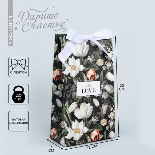 Плотность, г/м²: 210. Тематика: Цветочно-растительная. Тематика праздника: 8 Марта. Отделка пакета: Без отделки. Вид ручки: Без ручки. Особенности: Без особенностей. Бесплатная доставка: Да. Наша разработка: Да. Размеры товара: 13/23/7.