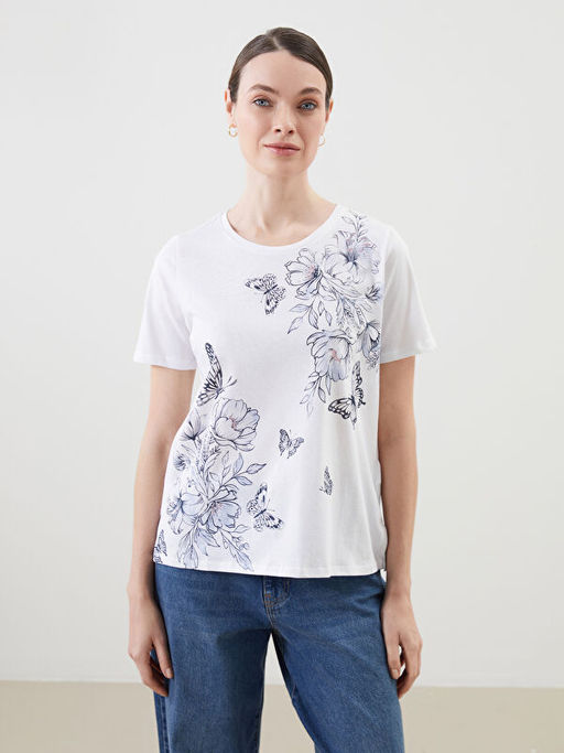 Bisiklet Yaka ?i?ekli Kad?n Ti??rt