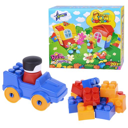 В комплекте 207 деталей конструктора: строительные блоки 2 видов, детали крыши, ограждения, 2 фигурки, машинка, паровозик, стрела крана. Размер стандартных блочных деталей 30-60 мм, высота 25 мм.