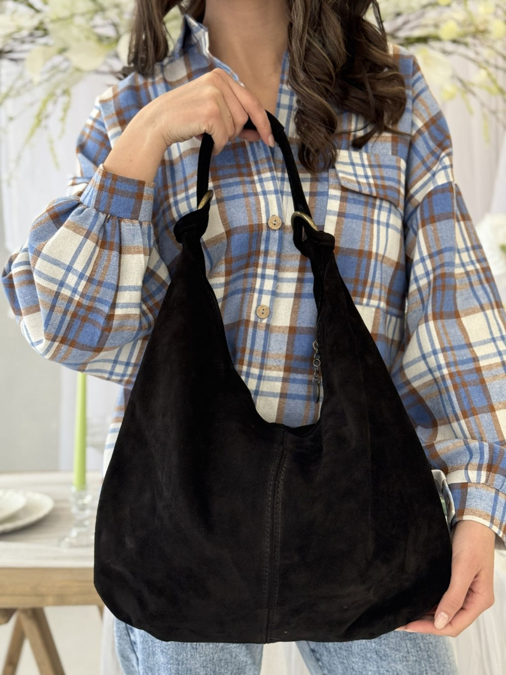 Страна: Италия Производитель: Pelletteria Luisa, Italy Размер: большая Стиль ношения: длинные ручки на плече Форма: мягкая Выделка кожи: замшевая гладкая Цвет кожи: Черный Оттенок: черный Упаковка: Пакет тканевый L, 40x40 см Палитра цветов: ODAR002 Размеры: длина: 45 см \tвысота: 34 см \tширина: 5 см \tвысота ручки: 34 см Описание: Сумка-мешок из натуральной итальянской замши - лёгкая, мягкая, элегантная... Новинка бренда Olivia Dar. Объёмная сумка-мешок, выполненная из натуральной замши премиального качества и сшитая на итальянской фабрике во Флоренции. Мягкая бархатистая фактура подчёркивает благородство материала, а лаконичный дизайн делает модель универсальной для любого гардероба. Сумка легко принимает форму наполнения, оставаясь при этом изящной и женственной. Вместительная, но визуально лёгкая, она идеальна для повседневных дел, работы, прогулок и путешествий. Длинная удобная ручка через плечо позволит комфортно носить её на плече, а продуманная внутренняя организация помогает сохранить порядок внутри. Каждое изделие создаётся вручную, проходя контроль качества, чтобы вы получали аксессуар, который будет радовать вас не один сезон. Особенности модели: 100% натуральная итальянская замша Пошив на фабрике во Флоренции Мягкая, бархатистая фактура Просторный внутренний объём Универсальная форма мешка / шоппера Подходит к повседневным, городским и более строгим образам Эта сумка - про свободу, лёгкость и стиль, который не нужно подчёркивать - он чувствуется сам.