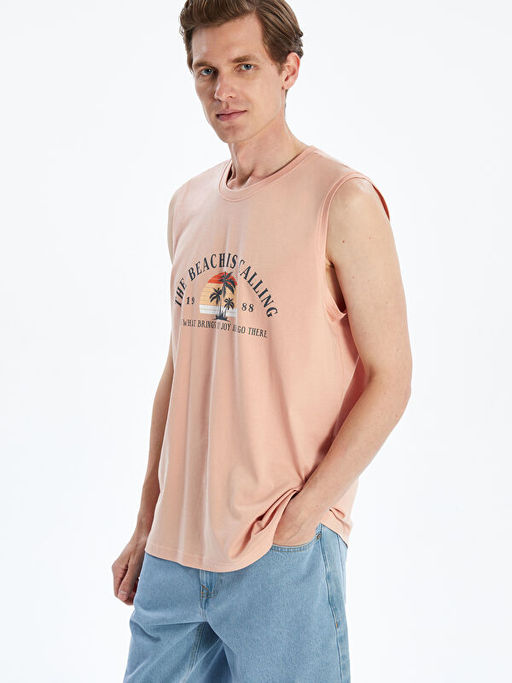 Bisiklet Yaka Bask?l? Erkek Kolsuz Ti??rt