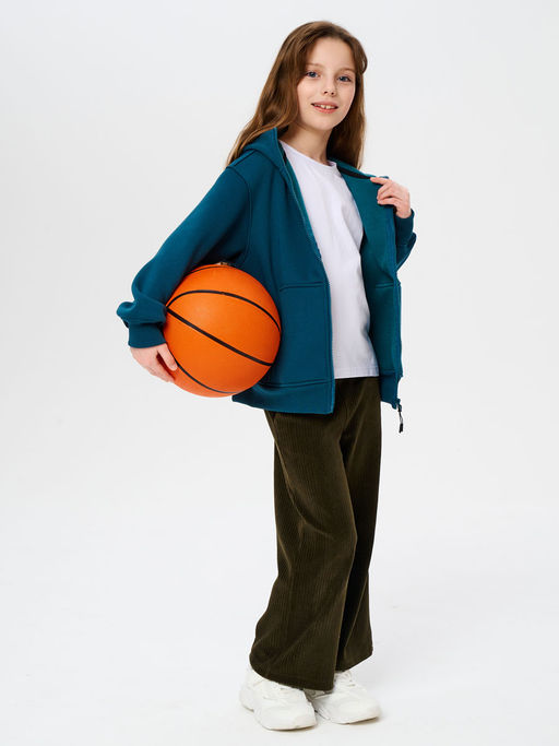 Толстовка детская из трикотажного полотна - футер с начесом, с втачным капюшоном, с центральной застежкой на молнию.  На полочке накладной карман-кенгуру. Манжеты и пояс из кашкорсе в цвет футера.­