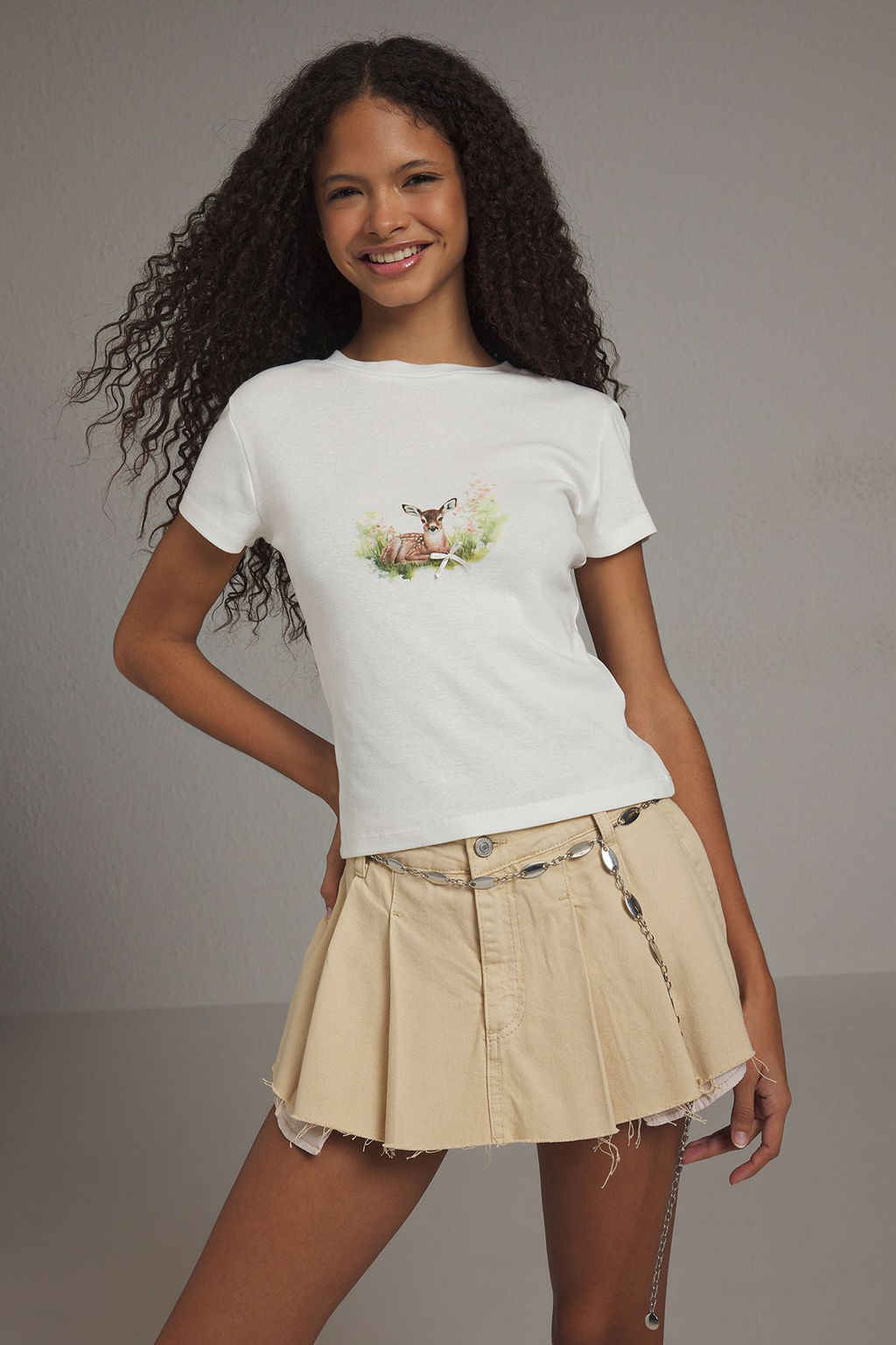 Ekru Geyik Bask?l? Fitted/Vucuda Oturan Orme T-Shirt TWOSS25TS00095