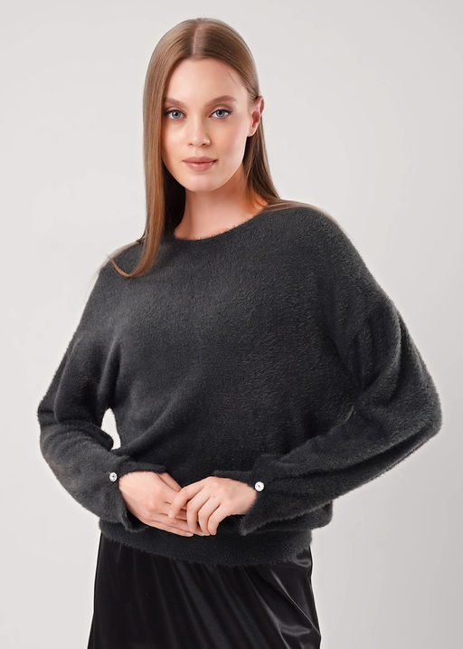 Вязаный джемпер умеренного объема, из фасонной пряжи травка, переплетение гладь. Спущенная линия плеча, длинный рукав. Округлая горловина с бейкой. По низу изделия и рукавов узкие манжеты. По низу рукава разрез с пуговицей. 100% полиамид(ПА)
