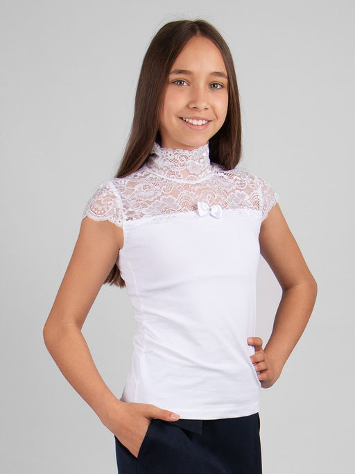 Воротник-стойка и рукава-крылышки выполнены из эластичного кружева. Мягкий, приятный к телу трикотаж обеспечит идеальную посадку изделия по фигуре. Модель прекрасно подчеркнет индивидуальный стиль девочки, и разнообразит ее повседневный школьный образ.