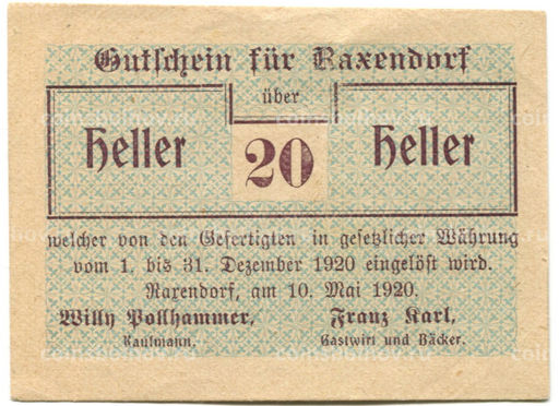 • Банкнота 20 геллеров 1920 года Австрия  Раксендорф (нотгельд)