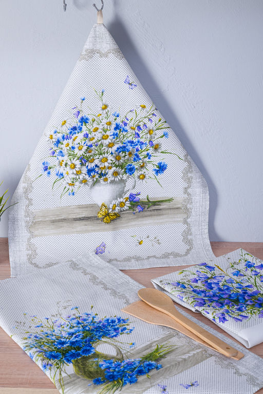 Набор кухонных полотенец из рогожки с букетами ромашек, васильков и колокольчиков порадует вас приятным для глаз дизайном. Изделия для кухни так же будут очень полезны в быту. Домохозяйки знакомые с полотенцами из рогожки ценят их за долгий срок службы и натуральность материалов.