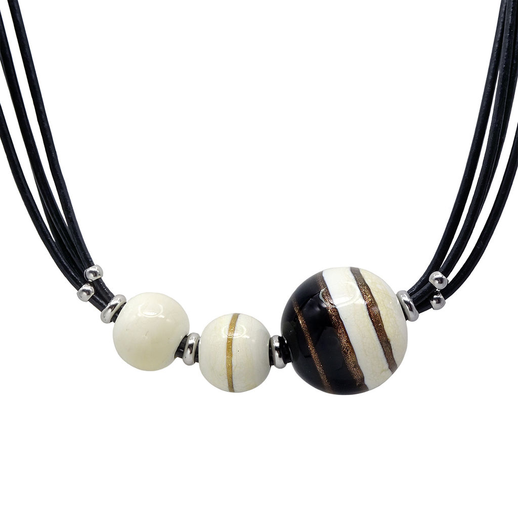 Колье изготовлено из натуральной кожи, муранского стекла и гипоаллергенной ювелирной стали, что очень важно для людей с чувствительной кожей. Металл не темнеет и не подвергается воздействиям окружающей среды, надолго обеспечивая красивый внешний вид изделия. Длина колье - 46 см + 5 см. удлиняющая цепочка. Диаметр стеклянных шаров - 1,5 и 2,3 см. Вес - 43 гр.­