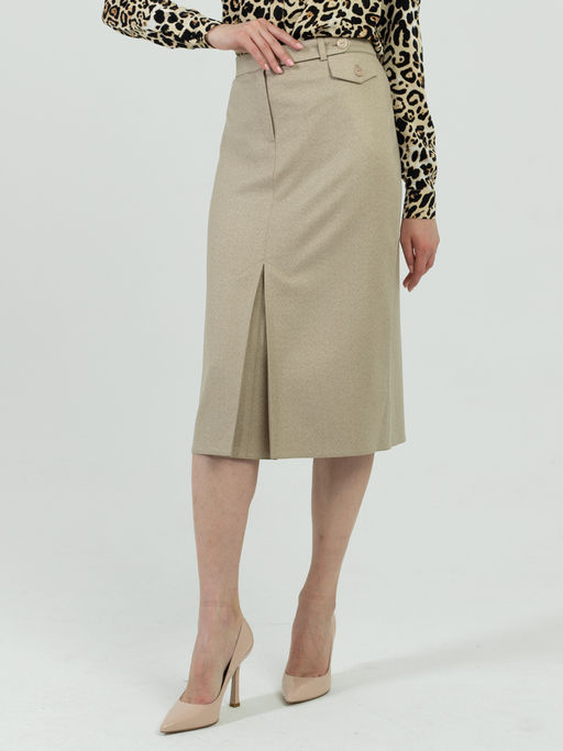 Женская юбка, прямого силуэта на подкладке с притачным поясом. Застежка расположена спереди по среднему шву на молнию и закрепляется двумя пуговицами (одна пуговица потайная). По среднему шву спереди расположена веерная складка, сзади карман в рамку, закрепленный пуговицей.Рубашка арт.976-0895