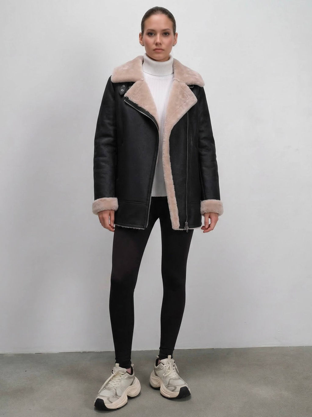 Стильная дублёнка-косуха из эко-меха. Модель застегивается на удобную молнию. Отложной воротник дополнен декоративными ремешками с застежкой, придавая изделию особый шарм. Практичные карманы делают эту куртку еще более функциональной.