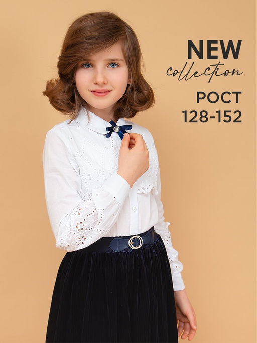 Блузка на пуговицах приталенного силуэта. Пуговицы дополнены стразами, передняя часть и рукава декорированы кружевной вышивкой. Модель дополнена съёмной брошью. Классический элемент школьной формы прекрасно вольется в гардероб каждой девочки.