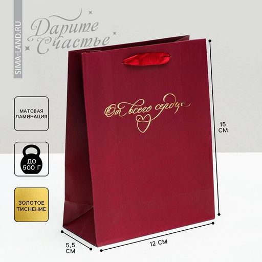 • Пакет подарочный ламинированный, упаковка, «От всего сердца», S 12×15×5.5 см, с тиснением