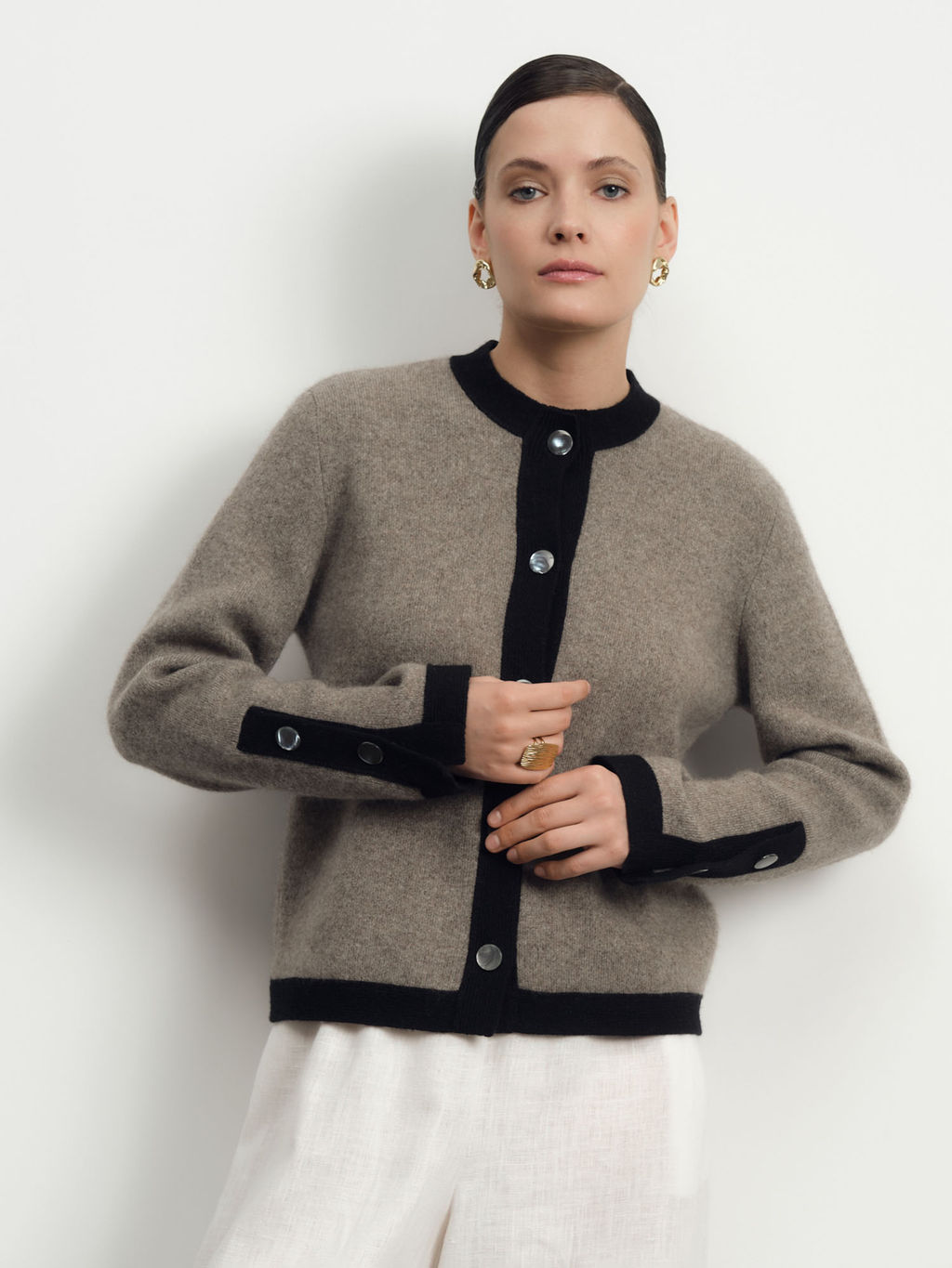 Контрастные манжеты с пуговицами, аккуратная планка спереди, лаконичная фурнитура.