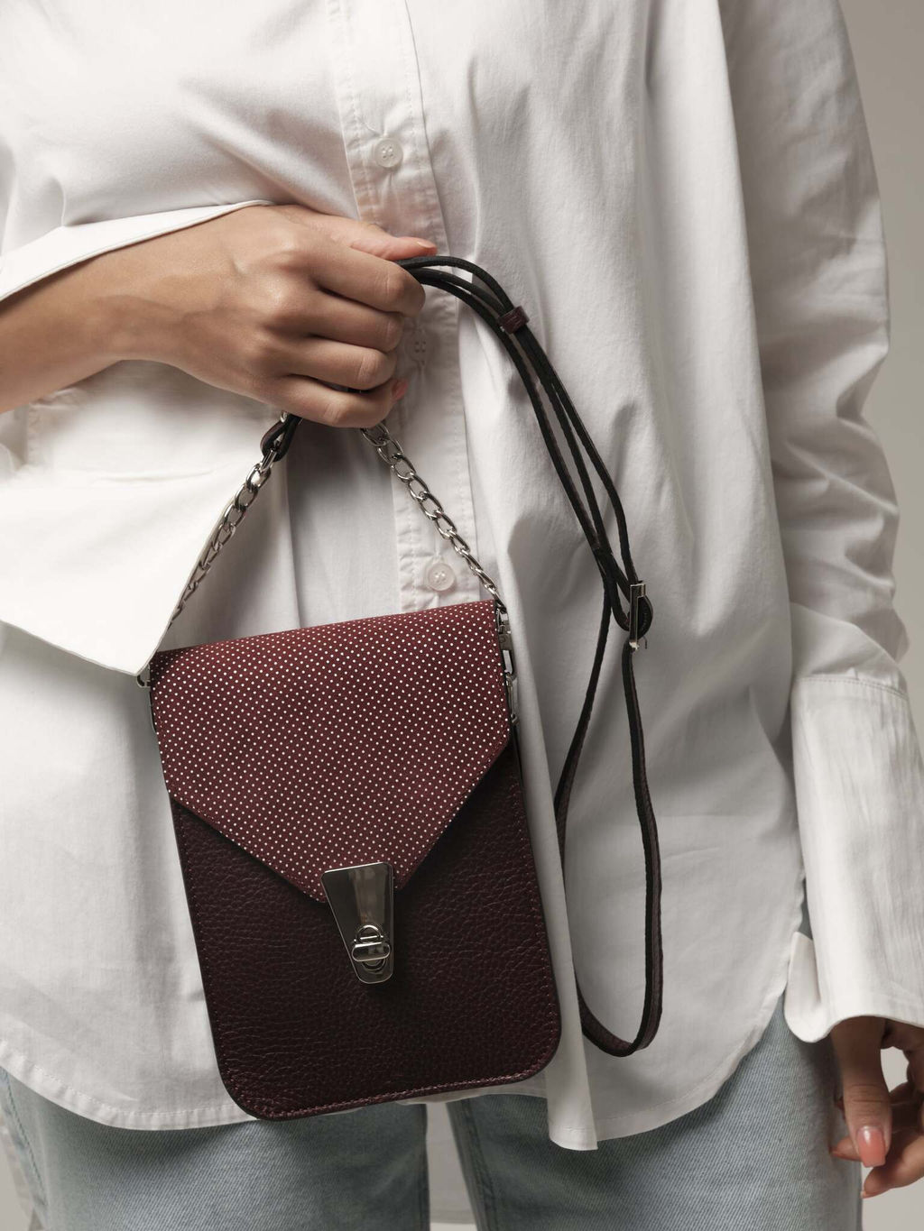 Небольшая сумка кросс-боди Deboro арт. 31023 в насыщенном бордовом цвете выглядит как стильный акцент для тех, кто любит сочетание оригинального дизайна и практичности. Модель выполнена из качественного материала с интересным сочетанием фактур: гладкая кожа корпуса сочетается с замшевым клапаном. Такой контраст делает сумку визуально выразительной и современной. Особого внимания заслуживает ремень: он комбинированный, с кожаной частью и металлической цепочкой, что добавляет образу легкую нотку элегантности и делает сумку более универсальной. Серебристая фурнитура - от цепочки до стильного поворотного замка - подчёркивает минималистичность дизайна и обеспечивает удобство в использовании. Компактные размеры (20x14x5 см) идеально подходят для прогулок, встреч и ситуаций, когда важно взять с собой только самое необходимое. Благодаря продуманному крою сумка смотрится аккуратно и современно, легко вписывается в повседневные и более нарядные образы. -- Характеристики -- Тип товара: Женские сумки Цвет: бордовый Материал: Натуральная кожа;Замша натуральная Бренд: Deboro Тип: Сумка на плечо, Сумка через плечо Страна-изготовитель: Россия Высота, см: 20 Ширина, см: 14 Глубина, см: 5 Материал подкладки: Хлопок Тип застежки: Замок-вертушка Длина плечевого ремня, см: 110-130 Вес товара, г: 350 Ручки: Плечевой ремень Пол: женская коллекция Группа товара: Сумки Выгружать товары на сайт: Да