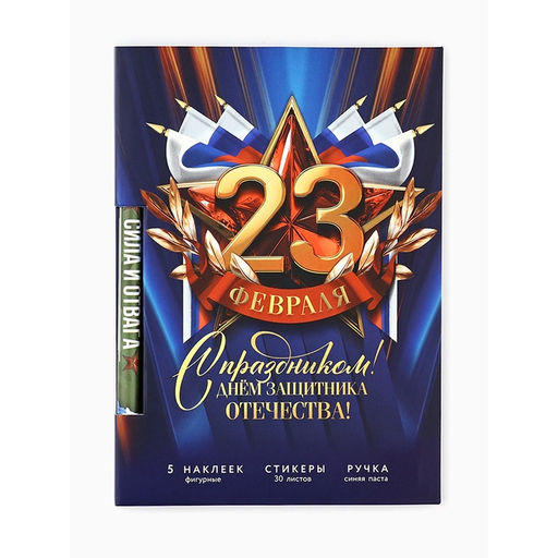• Подарочный набор, блок бумаги 30 л, ручка синяя паста 1.0 мм, наклейки 5 шт. «23 февраля»