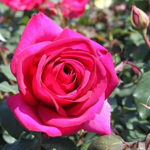 Чайно-гибридная. Роза с сильным ароматом и крупными (14-16см) густомахровыми цветками классической формы насыщенно-розового цвета с пурпурным оттенком. Аромат классический, чайной розы и сладких пряностей, к которым постепенно добавляется опьяняющая медовая нотка. Высота взрослого растения - 60-90см, ширина - около 50см. Листва крупная, блестящая.