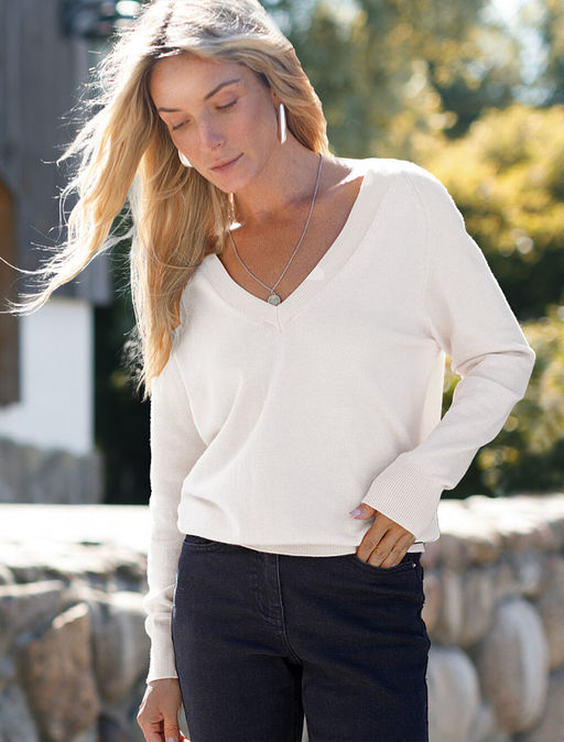 70%Хлопок 21%ПА 9%КашемирДжемпер тонкой вязки выполнен из хлопка с добавлением кашемира. Модель с V-вырезом свободного силуэта. Мягкая и очень приятная пряжа в рубчик совершенно не колется, сохраняет тепло при этом не перегревая, гарантируя безупречный комфорт.