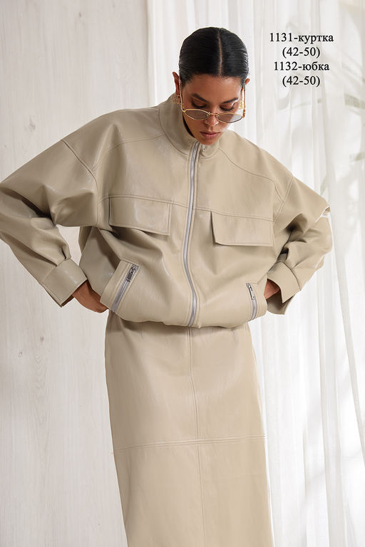 Мега стильная, объемная, укороченная куртка в стиле Casual, выполнена из мягкой экокожи, прямого силуэта, на вискозной авторской подкладке. Изделие на молнии. По переду прорезные карманы с листочками и декоративными молниями, горизонтальная фигурная кокетка, в которую вставлены декоративные клапаны. По плечу фигурные кокетки, переходящие на спинку. Спинка с фигурной кокеткой. Низ изделия на резинке. Рукав спущенный, рубашечный, длинный. Низ рукава на манжете. Воротник- стойка. На спинке лого.