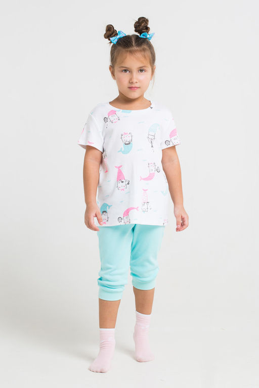 Пижама для девочки из трикотажного хлопка. Футболка с блестящим принтом. Короткие рукава со спущенным плечом. Спинка оформлена длиннее полочки, разрезы по низу боковых швов. Бриджи на эластичной резинке. По низу штанин тянущиеся манжеты.­