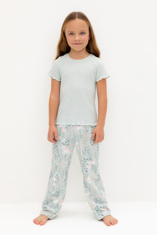 Трикотажная пижама из натурального хлопка. Футболка с короткими втачными рукавами изготовлена из эластичного трикотажа в рубчик. Брюки с эластичной резинкой в поясе выполнены из гладкого трикотажа супрем. Оригинальная набивка выполнена из стойких текстильных гипоаллергенных красителей. Изделие сохраняет цвет и форму после многократных стирок. Все трикотажные полотна производятся в соответсвии с нормами швейцарского сертификата ЭкоТекс.. Состав: 100% хлопок