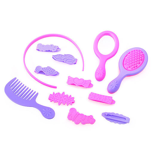 В наборе 12 предметов: расчёска (12х4 см.); зеркало (12.5х5.5х2 см.); массажная расчёска (12.5х5.5х2.5 см.); ободок (12х12.5х0.9 см.); 8 заколок (5 см.). Пользуясь аксессуарами из набора, ребёнок может делать причёски куклам и другим игрушечным посетителям своего мини-салона. Игра с таким наборам развивает у детей сюжетно-ролевое мышление, воображение и мелкую моторику рук.