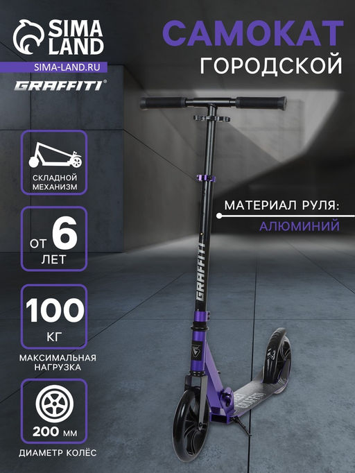 • Самокат городской GRAFFITI, складной, колёса PU 200, 86A, ABEC 9, подножка, цвет фиолетовый