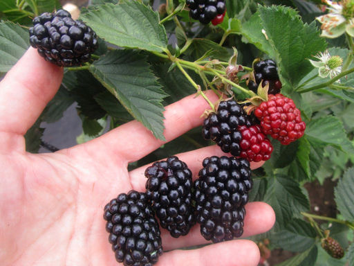 Ягоды американской ежевики "Heaven can wait" вытянутой формы, крупные, красивые, сочные, с мелкими костянками. Созревают не все сразу, а постепенно. На одной веточке находятся одновременно и спелые, и покрасневшие, и зеленые ягоды. Каждая из них весит от 10 до 13 г. Если растение правильно обрезать, то почти все ягоды будут одного размера. Соцветия из пяти лепестков такие же фиолетовые, как и у других сортов ежевики.