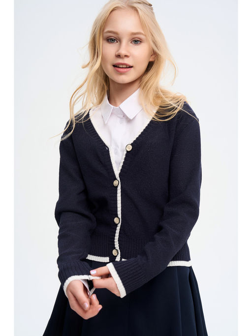 Вязаный кардиган для девочек стильного джинсового цвета. Силуэт- оверсайз, с контрастной отделкой по краю низа, рукавов, краю борка и горловины. Вязка оригинального переплетения 12 калибра. Премиум пряжа Состав:50% вискоза, 50% полиэстер