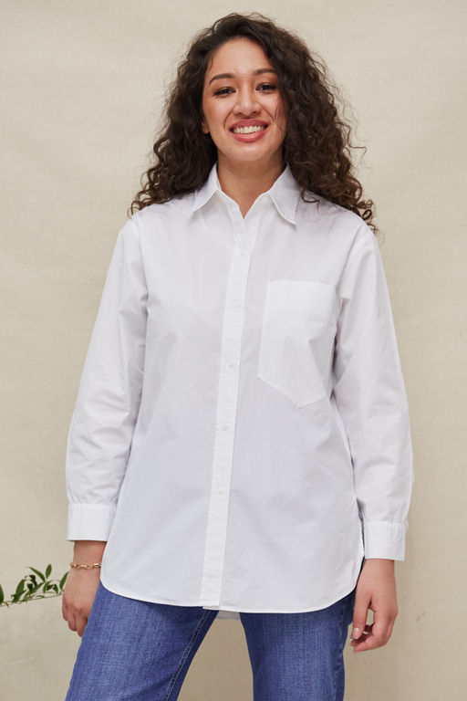 Рубашка из хлопковой ткани свободного силуэта с застёжкой на планке. Низ изделия с закруглениями по бокам и разрезами. Рубашечный рукав на манжете с застёжкой на пуговицы. Вырез горловины обработан отложным воротником на стойке. На задней части изделия выполнена кокетка с небольшой складкой. На передней-накладной карман в области груди. Достоинство этой модели в способности скрыть некоторые недостатки фигуры. Её можно сочетать как с брюками, так и с джинсами.