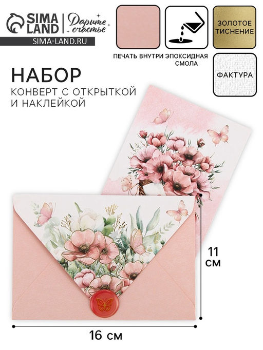 Цена за 5 шт. Конверт для денег с открыткой и наклейкой Нежные цветы, тиснение, акварельный картон, 16 х 11 см