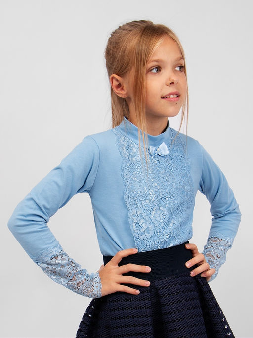 Изысканный гипюр на рукавах и передней части блузки образует цветочный узор. Горло - стойка. Мягкий, приятный к телу трикотаж обеспечит идеальную посадку изделия по фигуре. Гармонично вольется как в школьный, так и в праздничный гардероб.