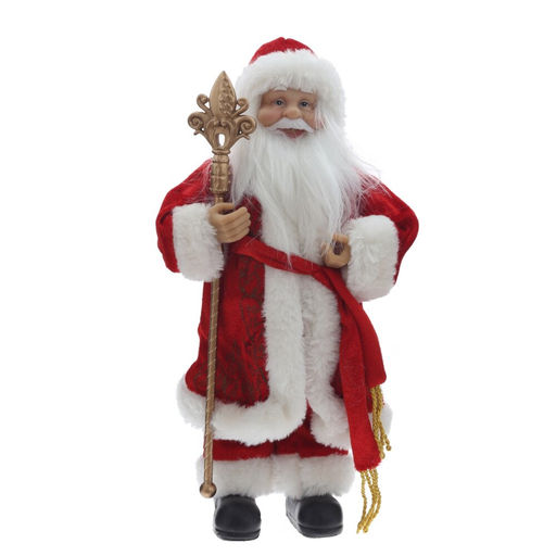 Дед-Мороз с посохом. Туловище мягконабивное, голова, ноги и руки из пластмассы. Кафтан из синтетической бархатной ткани красного цвета с золотой отделкой оторочен искусственным мехом.