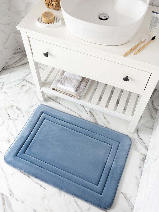 Коврик для ванной и туалутной комнаты DeNASTIA Soft Collection с эффектом памяти, подстраивающийся под форму тела и принимающий исходную форму. Пена памяти Memory Foam, обеспечивает уют и мягкость Вашим ногам. У ковриков нескользящая основа, не боится влаги. Уход: возможна стирка в стиральной машине, отдельно от другого белья, в щадящем режиме при температуре до 30 градусов. При первой стирке возможно выпадение мелких ворсинок, рекомендуем использовать специальный чехол или наволочку. Не сушите коврик на батареях и нагревательных приборах во избежание порчи антискользящей основы. Размер коврика 55х80 см, цвет синий.