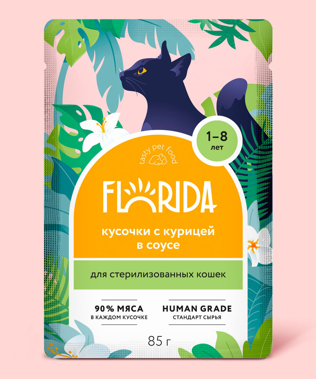Описание товара Новинка в линейке Florida - натуральные и сбалансированные по своему составу ПАУЧИ, отличительной особенностью которых является наивысший стандарт качества "human grade". Все ингредиенты проходят тщательный отбор, чтобы быть пригодными в пищу даже человеку. Линейка для взрослых кошек обеспечивает все потребности питомца и поддерживает его здоровье на должном уровне, а вариативность вкусов привнесет еще больше радости и удовольствия! Рекомендации по кормлению: Переход с предыдущего рациона осуществлять постепенно, небольшими порциями в течение 5-7 дней. При кормлении необходимо учитывать активность и аппетит животного. Корм должен быть комнатной температуры. Содержимое открытой упаковки хранить при температуре +5С и использовать в течение 2 дней. У кошки всегда должен быть доступ к свежей питьевой воде. Условия хранения: от -18 до +35С и относительной влажности воздуха не более 75%. Срок годности: 2 года с даты изготовления при соблюдении условий хранения