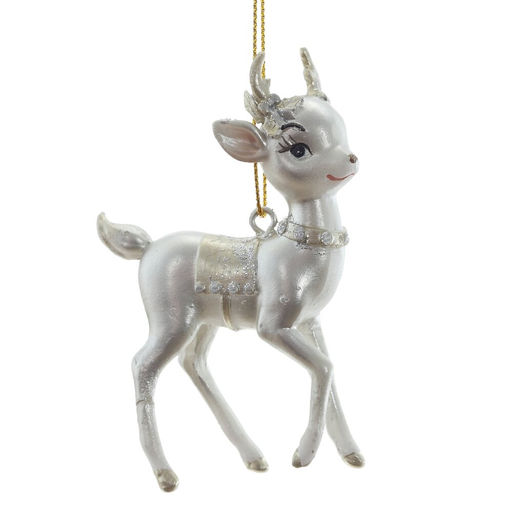 Подвесная декоративная фигурка оленёнка выполнена из полимерных материалов в изысканном серебристом цвете и украшена золотыми элементами. Легкий блеск и утончённый дизайн придают изделию праздничное сияние. Идеально подходит для новогодней ёлки, создания зимнего настроения и изящного акцента в праздничном декоре.