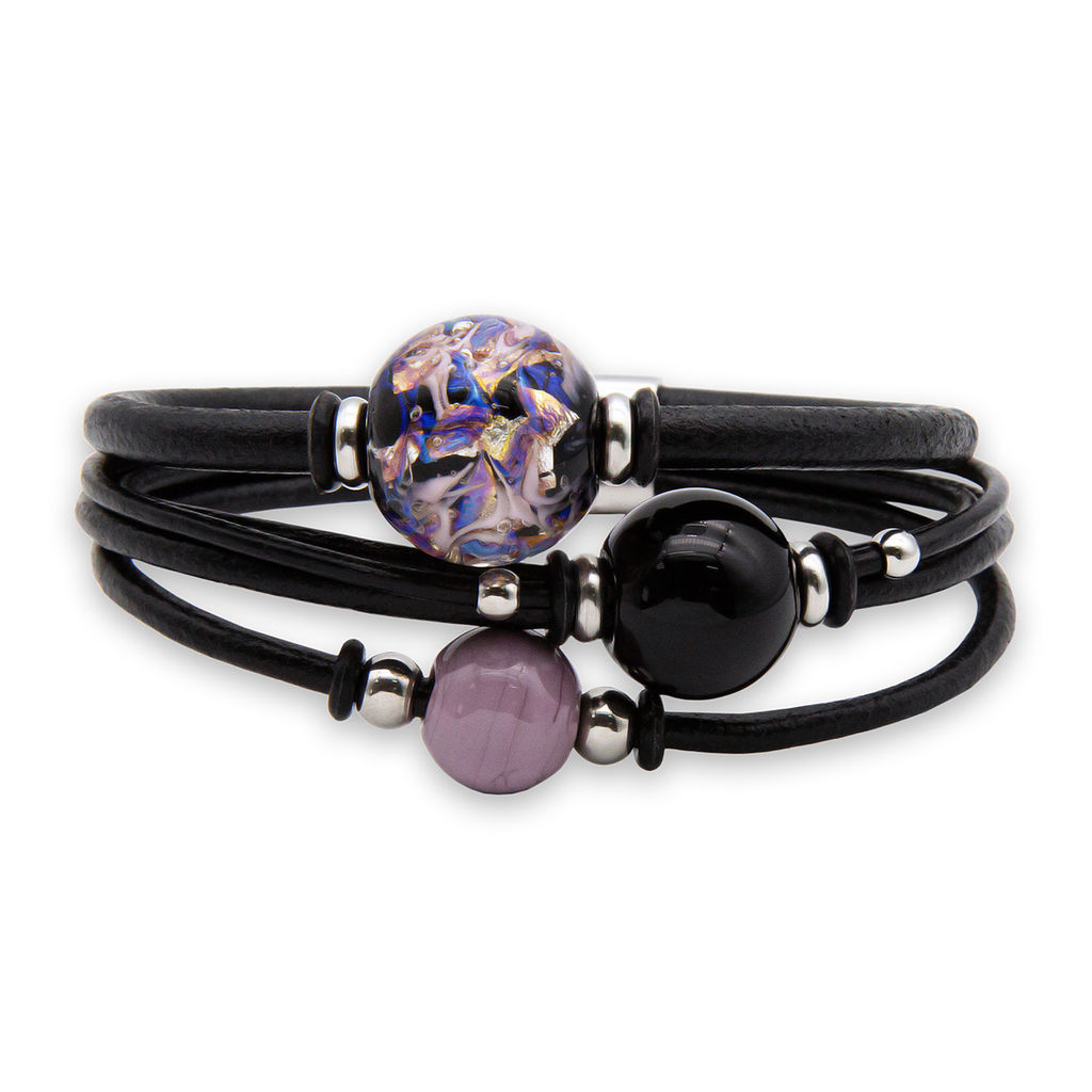 Браслет изготовлен из муранского стекла, натуральной кожи и гипоаллергенной ювелирной стали, что очень важно для людей с чувствительной кожей. Металл не темнеет и не подвергается воздействиям окружающей среды, надолго обеспечивая красивый внешний вид изделия. Крепкий магнитный замок с двойной защитой надежно фиксируется на запястье. Ширина браслета - 1,5 см. Диаметр стеклянных шариков - 1,2, 1,5 и 1,8 см. Вес - 32 гр.