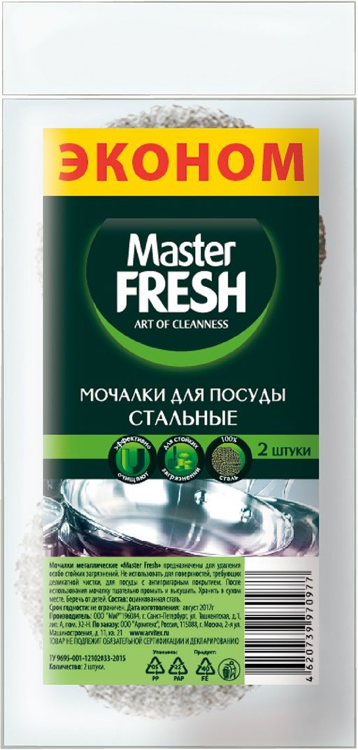 Внешний вид товара может отличаться от фотографий на сайте. Металлические губки для посуды Master FRESH "ЭКОНОМ" изготовлены из высококачественной оцинкованной стали. Эффективно удаляют затвердевшую грязь, пригоревший жир, копоть, ржавчину, плесень. Идеально подходят для очистки гриля, барбекю, кухонных предметов из чугуна, нержавеющей стали, меди и алюминия. Имеют увеличенный срок службы.