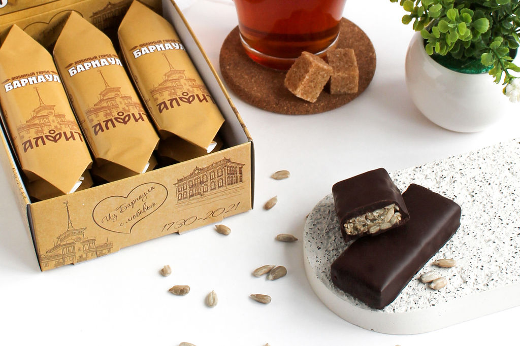 ТОВАР НЕ ЯВЛЯЕТСЯ ЛЕКАРСТВЕННЫМ СРЕДСТВОМ. ВОЗМОЖНЫ ПРОТИВОПОКАЗАНИЯ. Состав: горький шоколад (какао тёртое, какао-порошок с пониженным содержанием жира, эмульгатор соевый лецитин, натуральный ароматизатор ваниль), семя подсолнечника, мёд алтайский натуральный. Не является лекарственным средством Продукция соответствует установленным требованиям Евразийского Экономического Союза (ЕАЭС) Конфеты ручной работы Любимый город Барнаул натуральное, вкусное, полезное и сытное лакомство. Подойдёт для чаепития и в качестве перекуса, зарядит энергией и подарит хорошее настроение! Конфеты по весу и размеру больше, чем стандартные фабричные. Чувство насыщения часто приходит уже после одной конфеты. В начинке конфеты - дары природы Алтая - семечка подсолнечника и знаменитый алтайский мёд. Конфета покрыта вкусным горьким шоколадом. Конфеты Любимый город Барнаул имеют неповторимый вкус и природный аромат и уже завоевали популярность среди покупателей. Попробуйте и вы наш Любимый город Барнаул! Пищевая ценность в 100 г продукта: белки 8,8 г, жиры 38,9 г, углеводы 30,5 г. Энергетическая ценность: 539 ккал / 2255 кДж УСЛОВИЯ ХРАНЕНИЯ Срок годности: 6 месяцев. Хранить в сухом, прохладном месте при температуре от 3 С до 18 С и влажности не более 75%. Избегать попадания прямых солнечных лучей. ФОРМА ВЫПУСКА Масса нетто: 32 г 1 конфета. Шоу-бокс: коробка на 9 конфет. Форма регистрации: ГОСТ 4570-2014 Конфеты. Общие технические условия