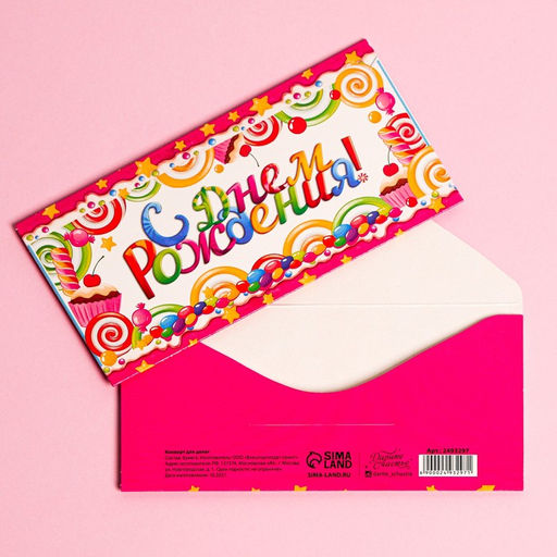 Цена за 9 шт. Конверт для денег «С Днём Рождения», карамельки, фактурная бумага ВХИ, 16.5×8 см