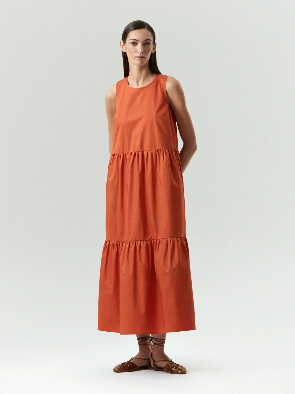 Ярусное платье на лето из натурального хлопка. Модный оттенок между терракотовым и апельсиновым задаёт позитивное настроение. Модель с круглым вырезом без рукавов имеет длину мидакси. Даёт образу объем и воздух. Платье отлично подойдёт для отпуска и выходных, фотосессий и пикников, а также для повседневных планов. Платье выполнено без подкладки.
