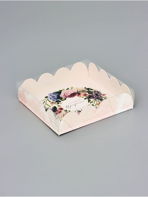 Прочный картон обеспечивает надежную защиту содержимого, а прозрачная крышка позволяет сразу оценить внешний вид угощений без необходимости открывать коробку.