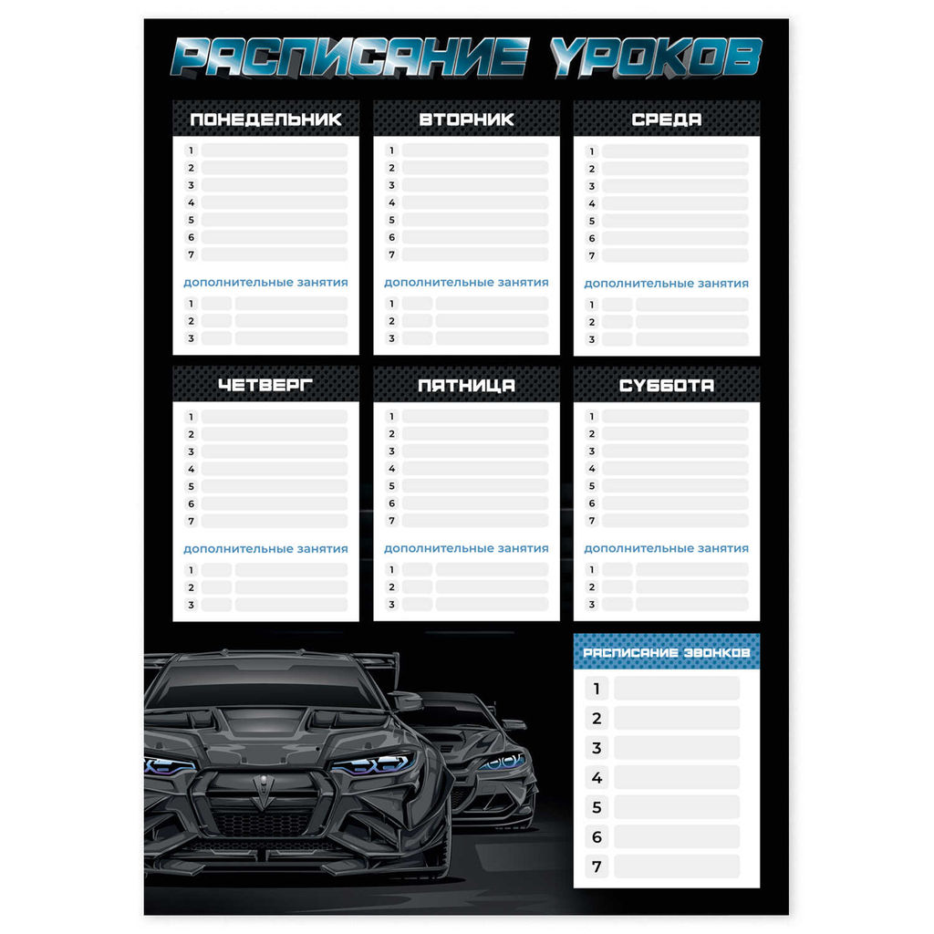 Расписание уроков А3, арт. 68848/ 50 ТАЧКА (297х420 мм, материал: мелованный картон 235 г/м?, полноцветная печать, декор: выборочный УФ-лак; цвет: чёрный, серый, синий; индивидуальная упаковка: нет)