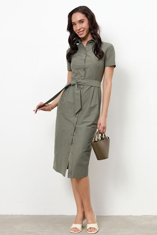 Платье приталенного силуэта из хлопковой плательной ткани. Изделие отрезное по линии талии с защипами. В боковых швах карманы. Втачной короткий рукав. Притачная планка с застёжкой на пуговицы. Вырез горловины обработан отложным воротником на стойке. В комплекте пояс из основной ткани.