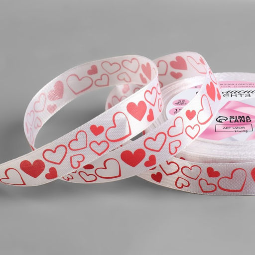Цена за 2 шт. Лента атласная «Сердечки», 15 мм, 23±1 м, белая, красная №001